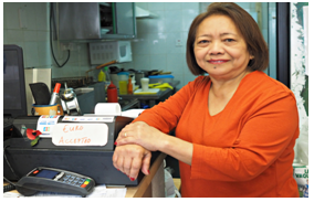 También Cristina [I75] está en su lugar de trabajo, donde se aceptan euros. Lleva en su mano un anillo, ¿de casada? Sus ojos, de edad madura, han contemplado trabajos y pesares, y expresan un intenso dolor vivido11. Pero la imagen quiere destacar que, a pesar de todo, ella sonríe y viste con un jersey de color naranja y lleva las uñas y los labios pintados de rojo, el tono de la pasión y de la alegría de vivir.