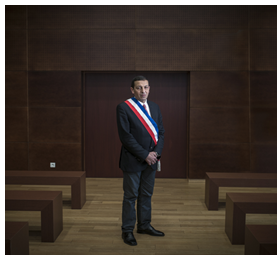 La expresión de Hosny [I149] es muy diferente. Está solo, de pie, en medio de una sala, en su centro, con los asientos vacíos, delante de una puerta cerrada, que lo enmarca como si fuera la fotografía de un dignatario colgada en la pared. Porta en su pecho una banda con los colores de Francia, y va bien vestido, con un traje oscuro y unos zapatos negros muy relucientes. Las manos están cruzadas debajo de su tórax y su pose general, así como el lugar central que ocupa en el espacio, desprenden seguridad en sí mismo. Además, su mirada es seria, de consciente responsabilidad, pues ha conseguido, con éxito12, ser un representante político en su país de destino13.