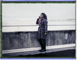 Arlete [I38] está sola, muy pegada a un muro, como buscando en él seguridad, pero al mismo tiempo queriendo estar cerca del mar, algo brumoso, que se abre detrás. Está hablando por el móvil y su cuerpo está hierático, con el brazo izquierdo caído, mientras que su expresión es muy seria y concentrada: está comunicándose con alguien muy cercano y al tiempo lejano, al que no puede ni tocar ni abrazar. Para reforzar estas paradojas y emociones, es un día frío y eso la obliga a abrigarse mucho y, de este modo, a ocultar la incomodidad de su cuerpo incomunicado, si bien un pañuelo rojo desplegado sueltamente sobre el cuello y extendido generosamente hacia su pecho recuerda levemente que viene de otro clima14, de otra intimidad, y manifiesta la nostalgia que la inunda15.
