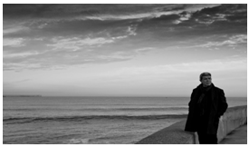 También José [I174] camina por la esquina de un paseo marítimo, muy pegado a un muro bajo que rodea las tranquilas aguas que se abren al infinito. Él, vestido con un abrigo negro que le protege su cuerpo y sus manos, ocultas, mira al lado contrario del mar, ¿hacia el lugar de su destino? Ahora bien, al estar muy ligado al muro y al agua, inmensas extensiones de su pequeño cuerpo, su mirada denota la nostalgia que siente al recordar lo que ha dejado atrás, tras las calmadas aguas, a las que él llamaría su “territorio emocional”16. De él forma también parte el cielo con nubes, que nos sugiere ensoñaciones diversas, lo que se refuerza con el mechón blanco de su pelo que, a modo de nube, conecta su cabeza y el cielo, sus recuerdos y el presente, de dónde procede y dónde se encuentra.