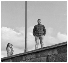 Marco [I231] aparece en esta fotografía en blanco y negro -como la anterior- en un contrapicado, algo distanciado y separado por una farola de una mujer y de una niña, que está en sus brazos y que son su familia17.Todos miran hacia el mismo lugar y lo hacen seriamente, pero la de él es una observación de altura y dirigida hacia lontananza, lo que se refuerza por su ubicación en el borde y encima de un muro, que lo eleva. Dos arrugas paralelas encima de la nariz y entre los ojos indican que está concentrado en sus pensamientos, en sus recuerdos, mientras que sus brazos metidos en los bolsillos expresan -una vez más- una situación de espera, eso sí, tranquila, no desesperada. Sin embargo, el cielo tiene algunas nubes blancas que envuelven a la mujer y a su hija, pero no a la cabeza del hombre, lo que es posible que represente que él es consciente que el encuentro con los seres amados, motivo de su pensamiento, que están más allá del muro y del mar -que no atisbamos- nunca tendrá lugar18 y que la tranquila resignación es el último sentimiento que le queda al respecto.