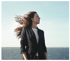 En un primer plano vemos a Gianina [I127], que está de pie, frente a un mar, suavemente picado y borroso, signo de su nostálgico estado de ánimo19,y un amplio cielo azul, más enorme que el propio océano, prolongación de un pensamiento que la lleva lejos. Además, tiene la cabeza ligeramente inclinada hacia arriba, los cabellos muy sueltos y la mirada hacia otro lado, atenta, con los ojos bien abiertos, las cejas arqueadas y los labios sensualmente entreabiertos, como si quisiera hablarle al paisaje de tú a tú, como si lo que tuviera que decirle fuera algo muy sentido e intenso. Por otra parte, lo que está más allá de este mar brumoso, levemente agitado y lejano, lo que se encuentra en la misma dirección que su cabello, no deja de constituir un electrizante recuerdo y un doloroso aguijón. Simultáneamente, la brisa marina que roza el rostro y las manos con las mangas alzadas y que ensortija el cabello denota, por el contrario, un más acá placentero y liberador. En suma, lo que Gianina desea comunicar es tan grande como un infinito cielo porque, en sus sentimientos, caben todos los matices de las contradicciones del alma humana, dolorida por la ausencia y, al tiempo, esperanzada por el deseo de libertad.