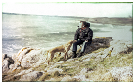 También Harry [I136] está al borde del mar. Acompañado solamente de su perro, que lo observa fielmente, está sentado pensativo sobre unas rocas en un paisaje solitario y al lado de unas olas algo movidas de tristes colores verdosos y grises. Pero él, a diferencia del resto de inmigrantes retratados, sí contempla ensimismado20 el mar y el sempiterno movimiento de sus olas, que cíclicamente van y vienen. Como tiene los labios entreabiertos, la mirada seria y el puño cerrado, parece querer decirle algo al piélago, pero con una cierta rabia o enfado21. Y es que ésta podría representar la elocuente imagen de un transterrado, de un “extranjero”, que llega a una tierra baldía y que deja atrás un horizonte brioso y un tiempo en el que todo está detenido; pero también que ahora está en un sitio en el que nunca sucede nada nuevo, en el que jamás avanza su integración.