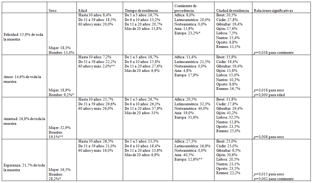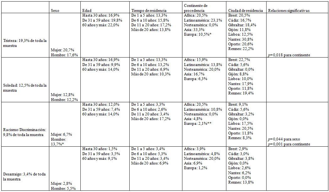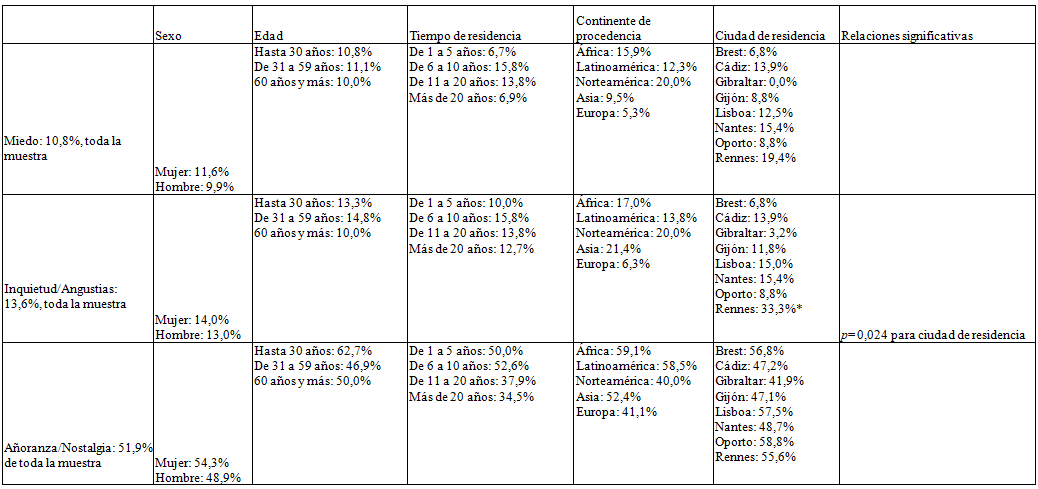 El miedo y el pasar inquietudes y angustias no presentan diferencias significativas en las cartas escritas por los migrantes seleccionados. La nostalgia es la emoción más extendida, pues la reporta un 51,9% de ellos. La tristeza, (señalada por el 19,3% del total)está más presente en los asiáticos, en el 33,3%. La soledad aparece en un 12,5% de las cartas. Un 9,8% reporta racismo y/o discriminación, concretamente en un 6,7% de las mujeres frente a un 13,7% de los hombres y en un 20,5% de africanos frente al 2,1%de europeos. El desarraigo lo expresa un 3,4%. Un 4,4% del total destaca la pobreza(hombres, 8,2%; mujeres, 2,8%) siendo los africanos y los asiáticos los que más la señalan. Le siguen los sacrificios (11,9%) y el esfuerzo (30,2%), aunque también aparecen la felicidad (15,9%), el amor (14,6%), la amistad (26,8%), la esperanza (21,7%) y la libertad (12,2%), siendo las mujeres las que más la citan, el 15,9% frente a los hombres, el 7,6%. El 44,7% expresa integración, destacando aquí los europeos (73,2%), y el 22%,el progreso personal, en este caso más los hombres que las mujeres.
