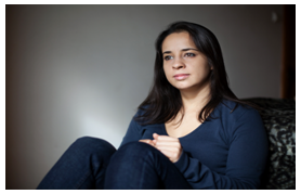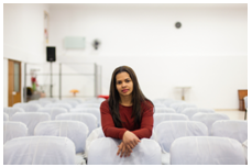 Elizângela [I97] está en una sala con butacas, sentada en una de ellas, sola38, como si fuera una espectadora del mundo, pero no una actriz del mismo; como si su vida sucediese en un teatro del que no puede ser protagonista, en el que -como revelan sus brazos, cruzados pasivamente y apoyados en la butaca delantera- no logra hacer nada. Quizás, por eso, su rostro es serio, melancólico incluso, y nos mira directamente a los ojos, con valentía, tal vez para contarnos su no-historia, lo difícil que es ser migrante39, sin esperar nada a cambio.