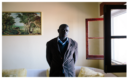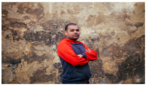 También Homoud [I146] estáde pie, pegado a una pared, desconchada, envejecida y con diferentes tonos de marrón, metáfora tal vez de su tierra originaria. Sin embargo, él está solo en la imagen y los colores del chandal que porta chocan, por su occidentalidad, con los terrosos que tiene detrás, expresando de este modo su profunda soledad y la nostalgia que tiene de la vida colectiva que desarrollaba8 en su terruño, la África a la que echa profundamente de menos. No obstante, su mirada, dulce y directa hacia nosotros, sin resentimiento, su ceja arqueada y los brazos cruzados sobre su pecho, cerca de corazón, logran trasladarnos, con emoción, su “esperanza de que todo salga bien”.