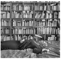 Martine [I250], una mujer rubia de mediana edad, está recostada sobre un sofá o cama, delante de una librería repleta de libros; en uno de ellos, se ve la palabra francesa “perdu”. Mira, ensoñadoramente, hacia arriba con sus ojos muy abiertos, a la misma dirección vertical que los libros, como si éstos, contrastados con la horizontalidad de su cuerpo, representaran sus esperanzas o la posibilidad de crecimiento personal o de ascenso social. Así parecen indicarlo también sus labios prietos, su rictus congelado, y la posición echada y soñadora de su cuerpo. ¿Pero, qué está meditando?, ¿qué es lo que ha perdido?, ¿qué es lo que ha ganado?, ¿su tiempo, un amor, otro país, otra cultura?
