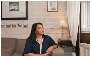 Hedia [I141] está en el salón de una casa. En la pared, hay una fotografía con una pequeña barca, vacía y varada en medio del mar, y otros cuadros y fotografías más pequeños relacionados con Túnez. También recuerdan a este país la chilaba con la que está vestida y la tetera que se haya encima de la mesa. Ella está sentada en la esquina de un sofá y mira, nostálgica, a la ventana cerrada que tiene una cortina plegada y que se encuentra a su lado. Por eso, aunque está cómodamente instalada y la casa no es pobre, Hedia parece algo ajena a su bienestar físico. De hecho, contempla el lado que está tras la ventana, signo quizás de su país de origen28, del que probablemente vino en barca y cuyos paisajes echa mucho de menos. En efecto, Túnez sigue muy presente en su vida, como constata toda la decoración de la estancia29, sin embargo, la ventana no está abierta, de modo que ella queda sola y encerrada con sus ensoñaciones, añoranzas y sentimientos más profundos, encerrada en una casa de aquí, pero que evoca la de allá.