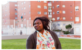Evelize [I102] es una mujer de color que está en una urbanización de pisos, de acogida30, con césped y zona deportiva. Su rostro trasluce que en este edificio se encuentra bien, sin embargo, ella le da la espalda y mira hacia otro lado, indiferente al lugar y a nosotros los espectadores, quizás porque siente nostalgia de ese otro territorio, lejano, y porque sueña jovialmente -sus ojos y su sonrisa, orientada hacia ese otro espacio, así lo desvelan- con lo que dejó atrás. Precisamente su camisa con mariposas de intenso colorido evoca ese otro sitio -que contrasta con la austeridad racionalista de la pared del inmueble-, tropical o subtropical, ¿Santo Tomé?