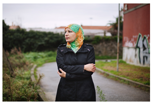 Fouzia [I118] anda, sola, por un camino que bordea un edificio con grafitis, que está difuminado, al igual que el resto de las construcciones. Está vestida con una gabardina de color negro que tapa casi completamente su cuerpo y porta un pañuelo de color en la cabeza -símbolo consciente de su tradición-. Mira hacia un lado distinto al del frente del camino por el que va, como si no importara el futuro, lo que está por venir, pero tampoco mira atrás31, como si estuviera en medio, en el margen entre el pasado y el futuro. Su desconcierto, su desubicación, se expresan mediante su mirada seria y triste, que la aíslan del entorno y de la realidad y que la introducen en un mundo onírico mental lleno de pensamientos y emociones que, una y otra vez, le recuerdan que ya no es ni de aquí ni de allí, pero, eso sí, -como expresa su abrazo a sí misma- que ahora ha alcanzado la autonomía personal32 y, por tanto, le queda la autoafirmación, el autoconsuelo y la autoayuda.