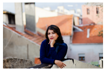 Hosna [I148] representa otra imagen de la soledad. Está en una terraza de un edificio. A ella se le ve muy bien, pero las azoteas de las otras casas del fondo se exhiben desvanecidas. Sin compañía37, su mirada es seria y -como indica la posición de su mano sobre la que apoya la barbilla- pensativa: ¿Tal vez recuerda con añoranza las tardes en las que se subía a la terraza de su casa del Magreb?
