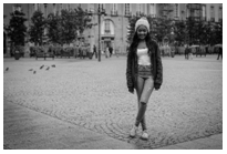 Como muestra el peculiar encuadre de esta fotografía, Lisa [I212] es una joven de color que está en un espaciopúblico, sin embargo, ella conforma una intensa imagen de la soledad y de la indiferencia de los demàs y, al estar ubicada en el centro de la composición, nos hace pensar, y mucho, a los espectadores sobre ello. Lleva unos vaqueros rotos y unas zapatillas blancas algo gastadas, con unas cordoneras entrelazadas apresuradamente, signo de rapidez y movimiento. Está de pie, en medio de la plaza, justo en el centro de la esquina del empedrado, lejos de las personas, que parecen indiferentes, lo que refuerza su marginalidad, su desconfianza, su situación “irregular”40, su soledad y, en suma, la distancia emocional con el lugar y las personas en él dispuestas. Por lo demás, ella cruza las piernas, como buscando posar cómoda, pero es un gesto efímero y aparente, pues los pies no están plenamente instalados en el suelo, lo que hace pensar que podría descruzarlos en cualquier momento y salir apresuradamente del sitio41. Además, nos mira directamente, a lo que se suma que sus cejas están arqueadas, sus ojos no plenamente abiertos y que tiene arrugas en los párpados, como si le pesaran, como si no quisiera ver todo lo que podría mostrársele, o como si deseara protegerse de lo ya contemplado. También exhibe una sonrisa contenida, si no forzada, y congelada en un rictus artificial, manifestando todo ello su deseo de ser feliz donde se encuentra y la imposibilidad de serlo.