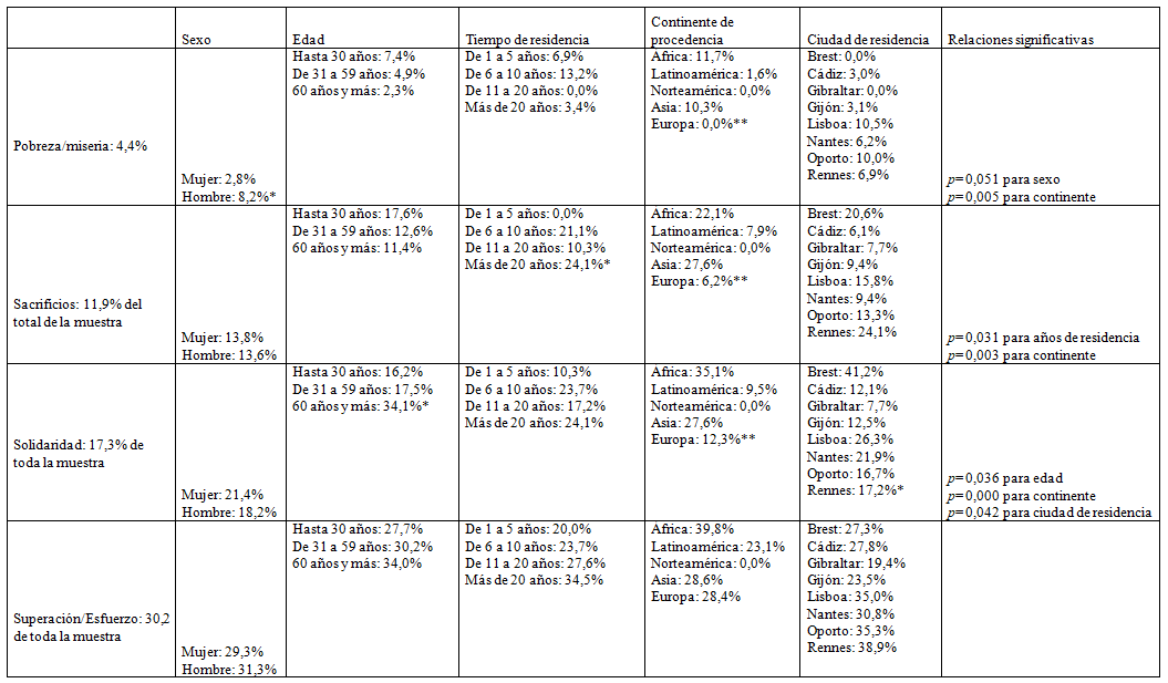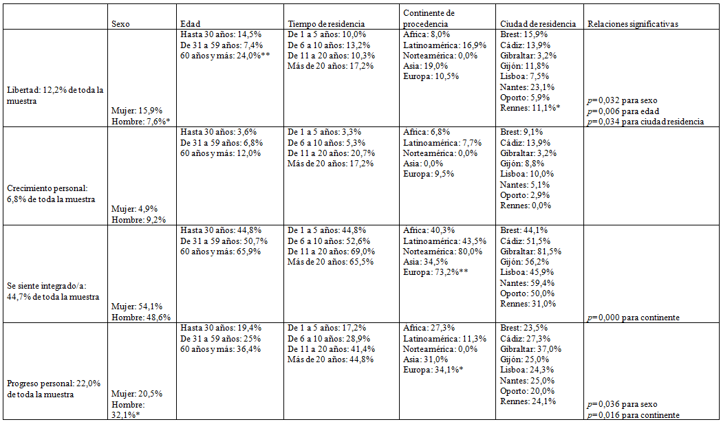El análisis refleja también otra cuestión, a explorar más profundamente en el futuro con dispositivos metodológicos como el que presentamos en este artículo: el hecho de que la mirada tradicional hacia la migración ha resaltado fundamentalmente los avatares negativos de la misma, y destacado los prejuicios de la sociedad de acogida. Sin embargo, la mayoría de los testimonios recogidos aquí muestran una realidad bien diferente, basada en experiencias positivas, de crecimiento personal y de libertad, no exentas de esfuerzo y, en ocasiones, de sufrimiento.