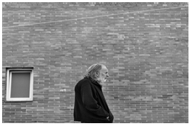Giuseppe [I130], un hombre maduro y canoso, camina por la calle, por delante de la pared de un edificio de ladrillo que solo tiene una ventana pequeña, cerrada. Además, lo vemos de perfil, ajeno a nosotros o al edificio, y su mirada pensativa se dirige hacia adelante, hacia lo que está por venir, pero sin convicción, como si fuera arrastrado, tal y como denota su lento caminar. Su espalda está ligeramente encorvada,probablemente como resultado de los numerosos pesos -físicos y psicológicos- soportados,mientras que sus manos se muestranmetidas en los bolsillos, inactivas y ocultas por el frío. ¿De dónde viene Giuseppe?, ¿hacia dónde va?, congelada su imagen frente a una pared de múltiples y fragmentados ladrillos que es mucho más alta que él, que lo limitan, y ¿que lo encierran?, sin apenas posibilidad de entrar, o de ver, dentro o fuera, lo que sucede. No extrañe que ande cansado y que la cabeza esté ligeramente abatida, como si soportara las múltiples fracturas, penalidades y faenas sufridas. Sin olvidar que, al contrastar el artista la fotografía en blanco y negro, la chaqueta oscura con el gris del edificio y el blanco de la ventana y, por consiguiente, al resaltar la ausencia de color, ha dado el tono melancólico de “un paria que trata de vivir allí donde cae”, de un caminante, de un desarraigado6.