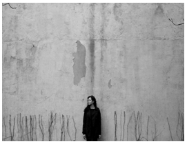 Diana [I81] está también de pie, delante y pegada a una pared muy alta, desconchada, metáfora del paso del tiempo y de las heridas sufridas. Esta pared es de color gris o blanco, lo que contrasta con la vestimenta y el pelo negro de ella. Además, una serie de plantas enredaderas se le adhieren verticalmente, pero sin hojas, como si estuvieran secas o como si aún no fuera la estación en la que rebrotan. Diana gira la cabeza con convicciónsobre su cuerpo erguido, por lo que su cuello está tenso, de manera que su visión es lateral y no central. Por tanto, la suya es una miradaenérgica, activa, que busca otro emplazamiento, otro lugar, y quizásanhela, con él,una futurarenovación personal7.