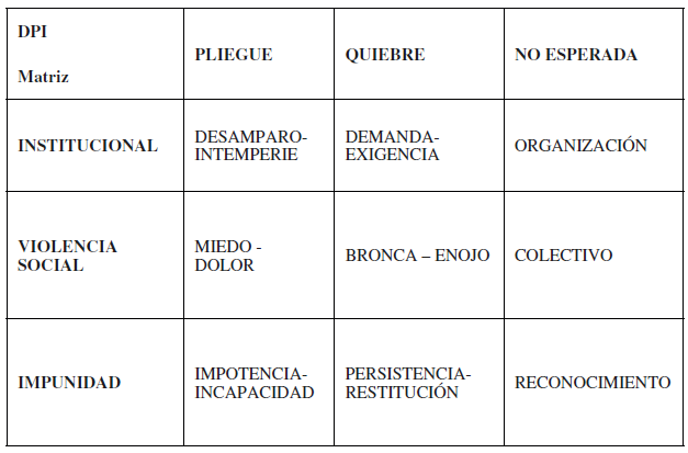 Las diversas formas que pueden tomar las matrices conflictuales pueden sintetizarse en las siguientes tres: institucional, violencia social e impunidad.