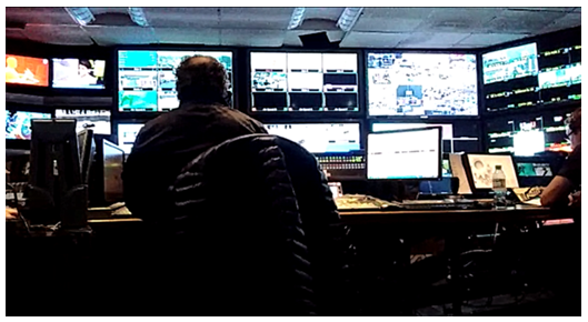 Llegamos al canal poco antes del comienzo del noticiero y nos dirigimos directamente hacia la sala de control. Entramos y saludamos. El productor ejecutivo y el resto del equipo nos estaban esperando. Nos dicen que nos podemos acomodar donde queramos o podamos. Nos sentamos en el centro, un poco en medio del paso, porque la sala no es muy grande y es el lugar que encontramos. Es un ambiente cerrado y oscuro, salvo por la luz de las numerosas pantallas frente a nuestros rostros. No tiene conexión visual con el plató más allá del que se produce mediado por cámaras y pantallas. Sentimos que estamos por empezar a observar un espectáculo desde la primera fila. Consultamos sobre la posibilidad de tomar fotos, notas y pequeños videos. Nos aseguran que el registro no era un inconveniente en ningún sentido. Intercambiamos unas breves palabras y enseguida inicia el ritmo vertiginoso de la emisión del programa. Nuestra presencia no parece incomodar ni distraer a ninguno de ellos. Nos hacen chistes y comentarios, pero cada uno sigue con su tarea y nuestra mirada no altera la rutina. (Notas de campo, 21 de julio de 2017)