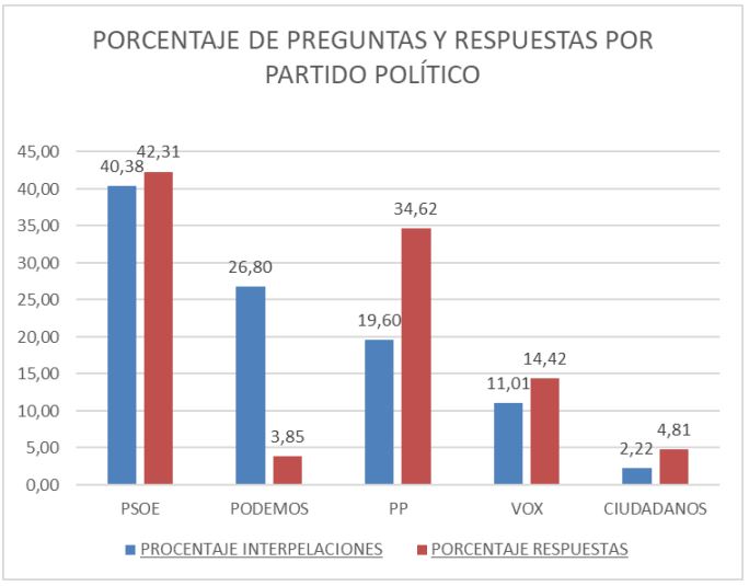 Para cumplir con el objetivo uno, se ha realizado una prueba Chi-cuadrado sobre bondad de ajuste comparando el porcentaje de interpelaciones totales dirigidas a cada partido con el porcentaje de respuestas emitido por cada uno de ellos. Se espera que la proporción de respuestas por partido sea equivalente a la proporción de interpelaciones dirigidas a los mismos. En caso contrario, diputados de un determinado partido estarían mostrando mayor o menor actividad de lo esperado.