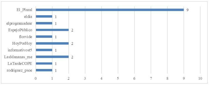 Para cumplir con el tercer objetivo de esta investigación, se ha observado si los diputados mostraban cierta tendencia a contestar a aquellas cuentas que pertenecen a personas influyentes en Twitter. Para ello, se han analizado con mayor detalle los patrones de respuesta de los congresistas y se ha implementado un análisis de redes sociales. Se eliminaron las respuestas de diputados hacia otros diputados con el fin de tener una base de datos en la que únicamente responden a cuentas influyentes no políticas. Así, la base de datos restante se compone únicamente de veintiún tweets. La práctica totalidad de estos, excepto dos (dirigido a una usuaria común de Twitter, @flordevide, y a @rodriguez_pose, un usuario más popular), iban dirigidos a medios de comunicación. En el siguiente gráfico se observa el número de veces que un usuario ha sido contestado por un diputado, destacando entre éstos @El_Plural, que ha recibido nueve respuestas de las veintiuna no dirigidas a otros diputados.