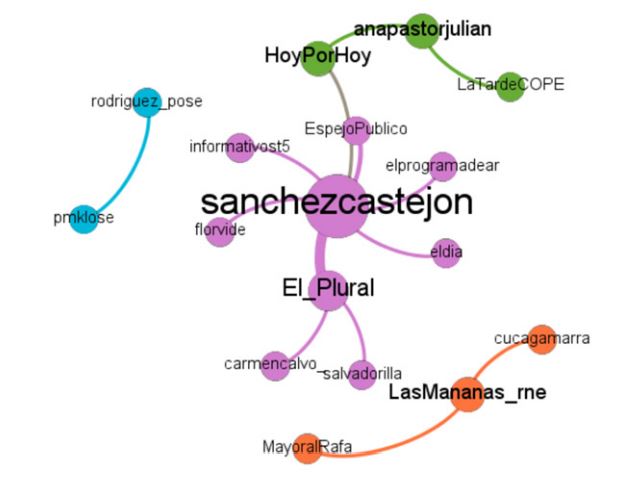 En el gráfico se puede observar la importancia de @sanchezcastejon en la red como el mayor emisor de respuestas entre ellas una a una usuaria común, @flordevide, aparte de las dirigidas a medios. Alrededor de este usuario se conforma la comunidad más grande de la red (color morado), en la que tiene un importante peso @El_Plural, medio receptor de varias respuestas por parte de congresistas del PSOE, y en concreto siete respuestas por parte de @sanchezcastejon. Otros usuarios relevantes de la red serán @anapastorjulian, que lidera una comunidad (verde) también conectada con @sanchezcastejon por medio de @HoyPorHoy; y @LasMananas_rne, que recibe respuestas de dos dipurtados de Podemos y PP, conformando una comunidad aislada (naranja). Por último, existe otra pequeña comunidad (azul) conformada por @pmklose (PSOE) y @ rodriguez_pose, un usuario no verificado ni con demasiados seguidores, aunque con cierto prestigio.
