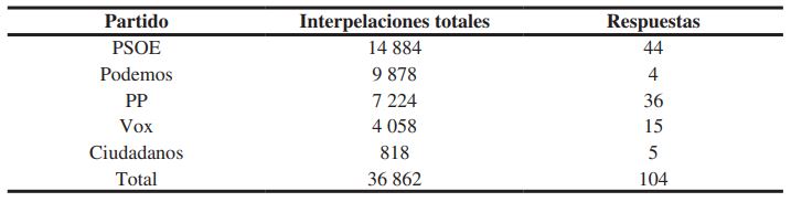 Para comprobar este supuesto, en este trabajo se realiza un estudio comparativo de la tasa de respuesta en Twitter a las interpelaciones directas dirigidas a los diputados de los cinco principales partidos durante el periodo de estado de Alarma en España: El Partido Socialista Obrero Español (PSOE); Partido Popular (PP); Ciudadanos (C’s); VOX; y Podemos. También se implementará un análisis de redes sociales para observar las comunidades que se generan a partir de las menciones y de las respuestas a las mismas. De esta manera, será posible observar qué diferencias manifiestan los diputados de Podemos en cuanto a su estilo comunicativo en redes sociales respecto a los diputados de los demás partidos.