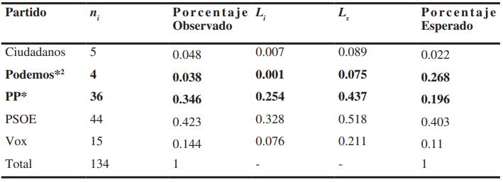 A continuación, se contrastan estas observaciones con una prueba ji cuadrado comparando las frecuencias de respuesta de los diputados según el partido al que pertenecen. Se espera que la proporción de respuestas por partido sea equivalente a la proporción de interpelaciones totales dirigidas a los mismos. Sin embargo, la prueba ofrece un estadístico ji cuadrado = 36.75, df = 4; p < 0.001. En la tabla 2 se puede observar que la proporción teórica del partido de Podemos y PP quedan fuera de los límites de confianza encontrados. Cabe concluir, que el partido PP muestra una mayor cantidad de respuestas respecto a la esperada en función a las interpelaciones recibidas, mientras que Podemos ofrece una frecuencia de respuestas significativamente menor a la esperada.
