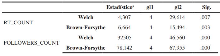 Tal y como se puede apreciar en la tabla 3, ambos estadísticos ofrecen una significación < 0.05, rechazando la hipótesis nula y concluyendo la existencia de diferencias estadísticamente significativas entre partidos a la hora de contestar interpelaciones en función a su número de retweets, así como al número de seguidores.