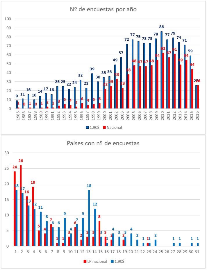 Las LP internacionales tienen una cobertura temporal más amplia (1977-2016) que las nacionales y por tanto muchas más observaciones (1.435 si solo contabilizamos las de países o 1.611 si incluyéramos las de regiones geográficas o agrupaciones por niveles de renta, frente a las 779 nacionales)41. Una parte de las diferencias puede deberse a que las LP internacionales incluyen a los países desarrollados, que proceden de las encuestas compiladas por el Luxemburg Income Study (LIS) database y de las EU-SILC de Eurostat, que son incorporadas a la base PovcalNet del Banco Mundial, como centro de datos para la apreciación de la pobreza en el mundo42. Otra parte de la explicación son las actualizaciones que realiza el propio personal del Banco Mundial en los países en desarrollo, pero sin la información primaria de una encuesta nacional.