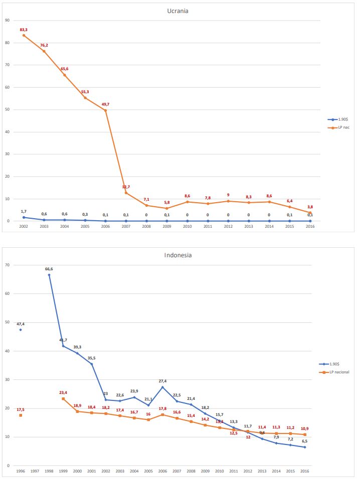 La comparación entre las LP nacional e internacional ofrecen casos de interés como el de Ucrania o Indonesia (Figura A.2.). En el caso de Ucrania (2002-2016) las reducciones relativas de pobreza son enormes en función de la LP que se utilice: -79,5 puntos porcentuales (p.p.) bajo la LP nacional frente a -1,6 p.p. bajo la LP internacional. Indonesia presenta el caso contrario: reduce su pobreza en -12,5 p.p. bajo la LP nacional y -60,1 p.p. bajo los 1,90$ al día. Indonesia es de los pocos casos en los que la LP internacional es mucho mayor que la nacional (hasta 2012).