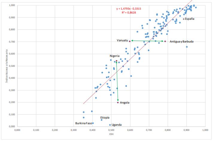 La correlación de Pearson entre el IAN y el IDH es de 0,9289 (R2=8628) y la correlación de Spearman entre sus respectivos rankings de 0,9370, con lo que podría afirmarse que el IDH es un buen proxy de acceso a “lo necesario” en corte transversal, pero no coincidente. La correlación del IAN con la renta nacional per capita es muy inferior: 0,6571 (R2=0,4318). Por ejemplo, España en 2015 ocupó el puesto 27 en el IDH mientras que aparece en el puesto 46 en el Índice de Acceso a lo Necesario. De los 161 países con datos disponibles, 54 países empeoran su valor respecto al que tenían con el IDH, lo que supone un tercio de los países de la muestra y 79 bajan en el ranking. La mayoría de los que empeoran su valor y ranking son países de África Subsahariana (los que más fueron Uganda, Etiopía y Burkina Faso) y alguno del Este de Asia (Timor, Mianmar, Camboya).