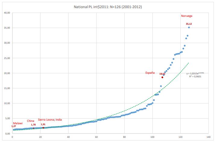 En la compilación de LP nacionales que hicieron Jolliffe & Prydz (2016) obtuvieron 126 encuestas entre la más antigua de 2003 (Gambia) y las más modernas de 2012, a partir de los datos disponibles en el Banco Mundial, la OCDE o el propio país (en los casos de EE.UU., Canadá y Finlandia). Las respectivas LP nacionales, trasformadas en dólares internacionales de PPA de 2011 iban desde el mínimo de USD 1,27 al día de Malawi (2010) o USD 1,40 del R.D. Congo (2012) hasta los USD 35,12 al día de Noruega (2011) o los USD 32,39 de Luxemburgo (2011)23 como muestra la Figura 1.