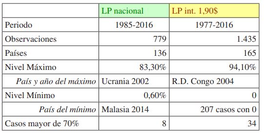 El mayor dato de incidencia de pobreza según las LP nacionales fue del 83,3% en 2002 en Ucrania, mientras que con la LP internacional fue en la R.D. del Congo en 2004 con un 94,1% de la población. El mínimo ofrecido por las LP nacionales fue el de Malasia en 2014 y con las LP internacional hay numerosos casos de 0% de incidencia. Por último, mientras que las LP nacionales contienen 8 casos de pobreza superior al 70% de la población, la internacional ofrece 3422. Conviene advertir la escasez de datos de que se dispone. Serajuddin et al. (2015) para el periodo 2002-2011, identificaron que para 29 países en desarrollo no se disponía de ninguna encuesta, para otros 28 países sólo había una observación y en 20 más apenas se contaba con dos observaciones separadas seis años o más, lo que dificultaría mucho su actualización. En total, sobre 77 de los 155 países en desarrollo, apenas se disponía de información fiable, lo que representa un 49,6% con datos deficientes o nulos. En suma, el grado de ignorancia sobre cuánta población en el mundo realmente carece de “lo necesario” es muy elevado.