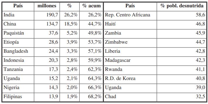 Si atendemos al porcentaje de la población del país carente de lo necesario en materia nutricional, los diez primeros países del ranking pueden verse en las dos últimas columnas de la Tabla 2.