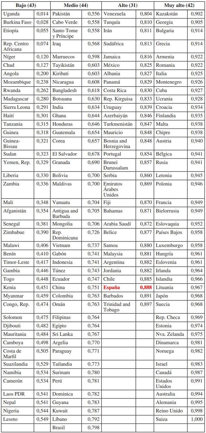 La clasificación de los grupos corresponde a: grupo “Bajo” menores de 0,550; Medio entre 0,551-0,779; Alto entre 0,800 y 0,899; Muy Alto, mayores a 0,900. Entre paréntesis, el número de miembros de cada grupo. Total muestral 161 países.