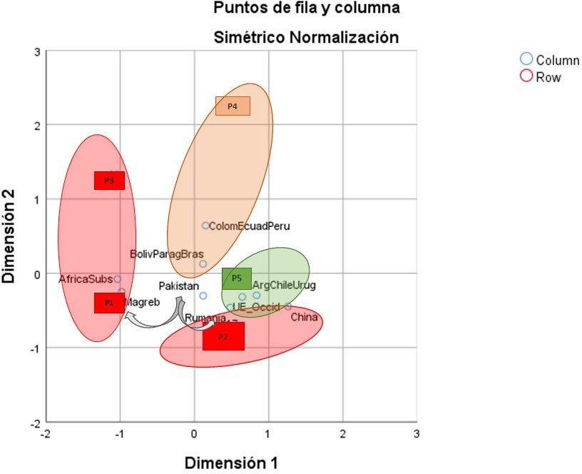Así, al Perfil 1 y Perfil 3 se asocian las familias procedentes de Magreb y África Subsahariana, que estarían en el cuadrante izquierdo, -el opuesto al cuadrante correspondiente al Perfil 5-. En el caso de Pakistán, compartiría algunas características de la Dimensión 2 con Magreb y África Subsahariana del Perfil 1. El Perfil 2 está asociado fundamentalmente a personas de origen chino, rumano y otras procedencias de Europa oriental, que parece compartir con el Perfil 1 las características de la Dimensión 2 (Vulnerabilidad económica), aunque al mismo tiempo comparte con personas de Argentina, Chile, Uruguay y UE Occidental algunas características de la Dimensión 1 (Falta de apoyo lingüístico). Por último, el Perfil 5 se asocia más a las personas de Argentina, Chile, Uruguay y UE Occidental, que presentan porcentajes muy bajos de personas que afirman que sus descendientes fueron escolarizados en centros con alta concentración alumnado de origen extranjero. Este perfil se ubica en el extremo opuesto a los Perfiles 1 y 3 en la Dimensión 1. En este sentido, el Perfil 4 se asocia más con Bolivia, Paraguay y Brasil, Colombia, Ecuador y resto de países latinoamericanos, y estaría en el cuadrante opuesto al del Perfil 2 y 1 en la Dimensión 2, pero compartiría características de la Dimensión 1 con el Perfil 2 y 5.