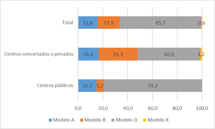 Centrándonos en los datos de distribución del alumnado en el sistema de modelos lingüísticos, cabe mencionar que, aunque la mayoría del alumnado está matriculado en el modelo D, la matriculación por modelos lingüísticos varía según la titularidad de los centros, donde los centros públicos son los que aglutinan la mayor oferta de plazas en el modelo A. Así, en la red pública sube el porcentaje de alumnado matriculado en el modelo D (79,2%) y baja el porcentaje del alumnado matriculado en el modelo B (5,7%). En los centros concertados o privados, en cambio, baja el porcentaje de alumnado matriculado en el modelo D hasta el 50,9% y la mitad está matriculado en el modelo B (31,3%) o en el modelo A (16,6%) (Ver Gráfico 1).