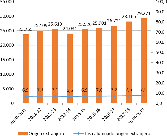 Una vez que hemos expuesto los principales rasgos del sistema escolar vasco, vamos a presentar los datos del alumnado nacido en el extranjero. Atendiendo a su evolución, tal y como podemos ver en el Gráfico 2, el porcentaje de alumnado de origen extranjero en la CAE permanece constante en el periodo 2010-2019, aunque ha crecido en números absolutos desde el curso 2013/2014. Así, en el 2013/2014 había 24.031 alumnos y alumnas de origen extranjero, cifra que aumenta hasta 29.271 en el periodo 2018/2019.