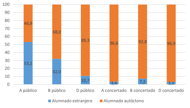 A continuación, analizaremos la distribución del alumnado de origen extranjero y autóctono en los seis estratos que se conforman en función de la titularidad de los centros, públicos y concertados, y, por otro lado, por los conformados en función de los modelos lingüísticos: A público, B público, D público, A concertado, B concertado y D concertado.
