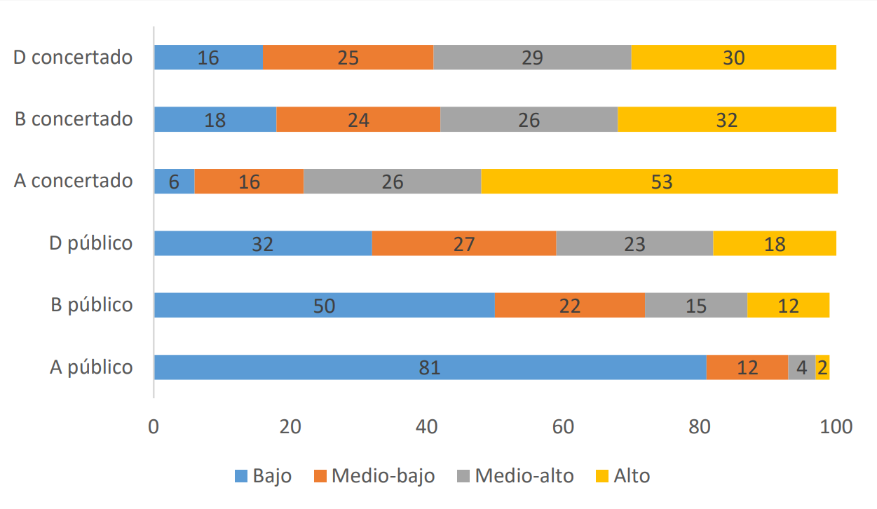 Así mismo, y como ponen de relieve diferentes estudios a nivel internacional (Gorard y Smith, 2004; Orfield y Lee, 2005; Stephan, 2013, entre otros), resulta imprescindible analizar la influencia de la educación privada en la segregación escolar. Estos estudios señalan que el nivel de segregación escolar entre las escuelas públicas y privadas es cada vez mayor en términos de desigualdad socioeconómica de sus estudiantes. El estudio de Jenkins, Micklewrigh y Schnepf (2008) indica que la magnitud promedio de la segregación escolar por nivel socioeconómico en las escuelas privadas es de 0,11 puntos y de 0,008 en el caso de las públicas. En España, trabajos de Mancebón-Torrubia y Pérez-Ximénez de Embún (2009; 2010), Salinas y Santín (2012) y Bernal y Vera (2019) subrayan una relación positiva entre el nivel socioeconómico y la probabilidad de asistir a un centro concertado. Así, los hijos e hijas de inmigrantes y el alumnado que proviene de hogares con menos capital económico, social y cultural están más representados en centros públicos, y dentro de estos, en un espectro concreto; y el alumnado cuyos padres poseen mejores trabajos y mayores niveles de estudios y disponen de una mayor dotación de bienes y recursos culturales, están más representados en centros concertados o privados.