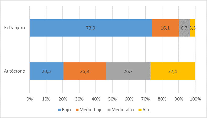 La importancia de analizar conjuntamente la magnitud de la segregación escolar por origen y por nivel socioeconómico y cultural de las familias es señalada por diferentes autores (Murillo y Belavi, 2018; Murillo y Graña, 2020). La escolarización del alumnado inmigrante descendiente de familias con mayor nivel socioeconómico y cultural es completamente diferente de aquella que tienen quienes han entrado en España de forma irregular o como consecuencia de procesos de reagrupación familiar. De esta forma, la segregación escolar de los estudiantes inmigrantes con menor nivel socioeconómico y cultural es superior a la de los inmigrantes, por un lado, y a la de estudiantes pertenecientes a familias de menor ISEC, por otro. No podemos olvidar que la población inmigrante es especialmente vulnerable a cualquier deficiencia en la calidad de la educación recibida, puesto que repercute de peor manera sobre la población cuya situación inicial es desventajosa (Murillo y Belavi, 2018).