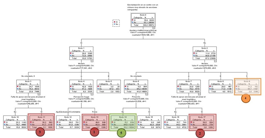 Tras el análisis de las características del alumnado de origen extranjero matriculado en los centros educativos de la CAE, se ha procedido a analizar los datos en su conjunto confeccionando un modelo que incluya las variables más relevantes que permiten acercarse al fenómeno en cuestión. Como resultado de dicho análisis, mediante la técnica multivariante de Detector Automático de Interacciones (CHAID) que permite detectar perfiles de personas inmigrantes encuestadas en función de la variable dependiente, la consideración de escolarización en un centro con un número muy elevado de escolares inmigrantes, en este caso, se ha obtenido un árbol de decisiones o de segmentación.