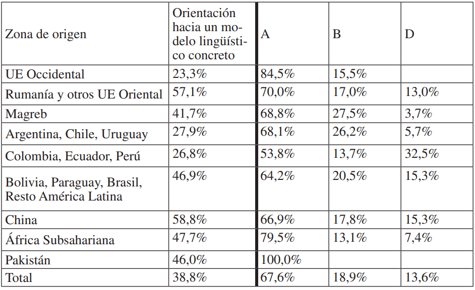 Respecto a la primera pregunta, tal y como se observa en la Tabla 3, el porcentaje de familias que han sido orientadas hacia un modelo lingüístico concreto a la hora de matricular a sus descendientes es bastante elevado, el 38,8% en 2018, a pesar de que se haya reducido casi a la mitad respecto a 2014 (65,8%). Por origen, las zonas que mayor tasa presentan son China (58,8%), Rumanía y otros UE Oriental (57,1%), África Subsahariana (47,7%), Bolivia, Paraguay, Brasil, Resto América Latina (46,9%) y Pakistán (46%). Por el contrario, el porcentaje de familias orientadas hacia un modelo lingüístico concreto en el momento de matriculación es más baja en el caso de los países de UE Occidental (23,3%).
