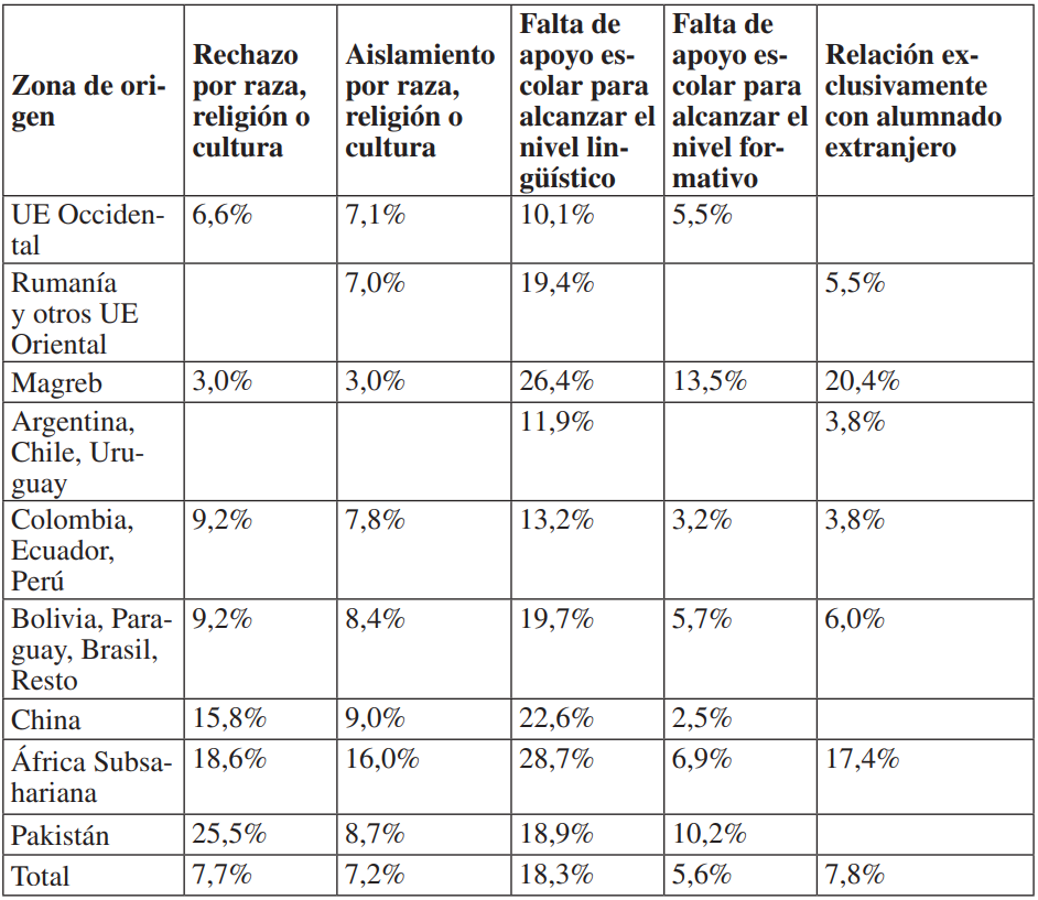 Por último, en cuanto a otras circunstancias mencionadas por la población inmigrante que nos ayuda a dibujar el contexto de incorporación, en la Tabla 4 se observa que, aun siendo baja, es más frecuente la falta de apoyo escolar para alcanzar el nivel lingüístico (18,3%), siendo el porcentaje más alto entre la población de África Subsahariana (28,7%), Magreb (26,4%). China (22,6%). En cuanto a la problemática de la relación exclusivamente con alumnado extranjero, se menciona por el total de 7,8% de personas de origen extranjero, y es más elevado entre la población de origen magrebí (20,4%) y africano subsahariano (17,4%). El rechazo por raza, religión o cultura se menciona en el 7,7% de los casos, y se observa más entre los y las procedentes de Pakistán (25,5%) y África Subsahariana (18,6%), mientas que el aislamiento por este mismo motivo es mencionado por el 7,2% del total de personas encuestadas, y está más presente en el caso de África Subsahariana (16%). Por último, la problemática menos común es la falta de apoyo escolar para alcanzar el nivel formativo (5,6%). En este caso destacan Pakistán (10,2%) y Magreb (13,5%).