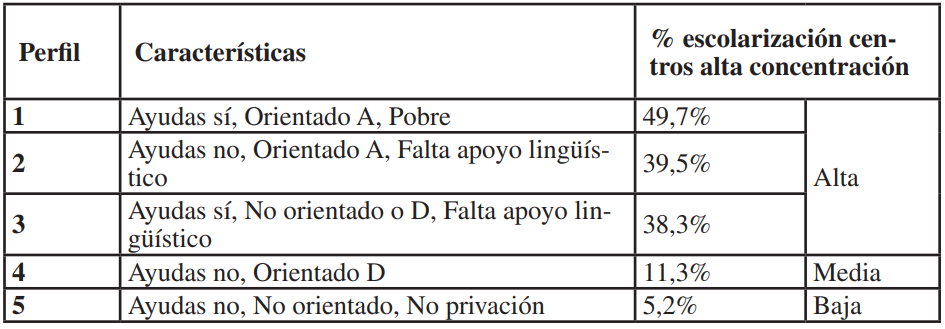 Como resultado, el análisis ha revelado cinco perfiles más importantes que se diferencian en función de si la unidad convivencial ha recibido ayudas sociales en los últimos 12 meses, así como si ha sido orientada hacia algún modelo lingüístico en concreto a la hora de matricularse, la situación económica del hogar y, por último, la falta de apoyo escolar para alcanzar nivel lingüístico. Así, el perfil con mayor incidencia de la problemática de la matriculación en centros con elevada presencia de escolares inmigrantes se caracteriza por tener las condiciones más desventajosas como son el hecho de percibir ayudas sociales, que indica una situación económica precaria, así como las situaciones de privación graves. Además, se trata de familias que han sido orientadas hacia el modelo A, que se caracteriza por una mayor tasa de personas con ISEC bajo. Este perfil se asocia más a personas procedentes de África Subsahariana y Magreb y, en menor medida, Pakistán.