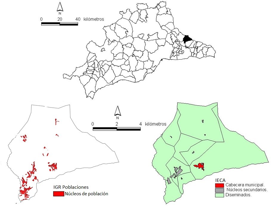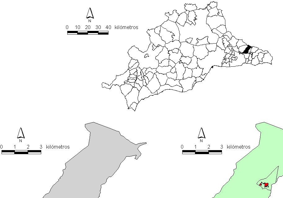 En la web del Instituto Nacional de Estadística –INE- (http://www.ine.es) es posible consultar la información padronal a este nivel de desagregación espacial, pudiéndose obtener información sobre la distribución por edad y sexo de la población, su nacionalidad y su lugar de nacimiento. Además, en el caso de la Comunidad Autónoma de Andalucía el Instituto de Estadística y Cartografía de Andalucía (IECA) cuenta con una base cartográfica en la que quedan representadas la totalidad de las entidades, núcleos y diseminados existentes en los municipios andaluces, base cartográfica a la que es posible añadir la información estadística padronal obtenida del INE. Como anteriormente hemos indicado, en el caso de los municipios con volúmenes de población muy reducidos, el Nomenclátor la distribuye como mínimo en población en núcleo y en población en diseminado. Pero en una cantidad significativa de ocasiones, en estos municipios pequeños, rurales, la nómina de unidades espaciales a las que el Nomenclátor refiere la población es considerablemente mayor que la correspondiente al seccionado censal. Y a partir de aquí es donde se aprecia la ventaja de emplear el Nomenclátor como fuente para el estudio de la distribución intramunicipal de la población en los municipios de población reducida. En este sentido, y aunque nosotros hemos empleado la base cartográfica desarrollada por el IECA, debemos indicar que el Instituto Geográfico Nacional (http://www.ign.es) ha desarrollado recientemente la denominada Información Geográfica de Referencia de Poblaciones. En esta base espacial se identifican, entre otros, los núcleos de las Entidades de población, tal y como los define el Nomenclátor, por lo que estimamos que puede ser gran utilidad a la hora de extrapolar nuestros hallazgos al resto de España, desde el momento en que esta base de datos espacial permite hasta cierto punto replicar nuestra investigación en aquellas Comunidades que no cuentan con una delimitación espacial propia de las entidades de población.