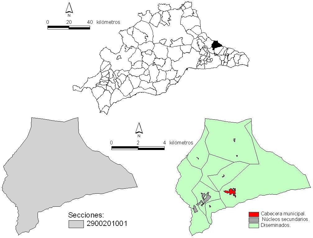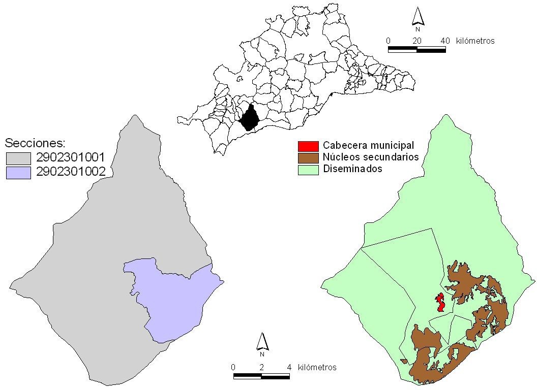 De nuevo el municipio cuenta con una única sección censal (figura 3), por lo que a partir de aquí no es posible conocer cómo se distribuye la población en su interior, menos aun diferenciándola por lugar de nacimiento; así las cosas, de optar por el seccionado como unidad espacial de referencia tan sólo podríamos indicar que su volumen de población es reducido, y que el porcentaje de nacidos en el extranjero es muy relevante. Sin embargo, acudir al Nomenclátor nos permite afinar bastante más en la cuestión de la distribución espacial según su origen, y aportar evidencias estadísticas de un fenómeno bastante común en la comarca malagueña de la Axarquía: la presencia de importantes volúmenes de población extranjera afincada en los diseminados municipales (Junta, 2006).