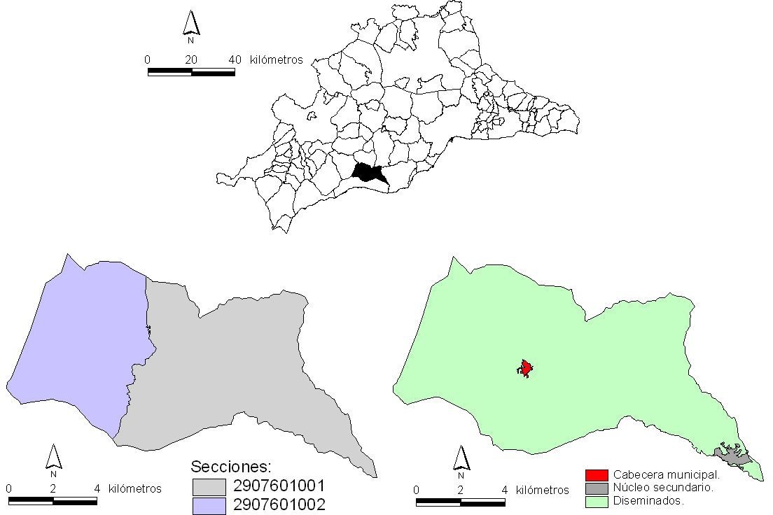 La cartografía del seccionado se muestra en la figura 4, y a partir de ella se puede derivar el hecho de que es la porción sudoriental del municipio la más densamente poblada –a partir de la población de las secciones y su extensión espacial-, y que es en esta misma porción –correspondiente a la sección 002donde la presencia de población extranjera es proporcionalmente superior.