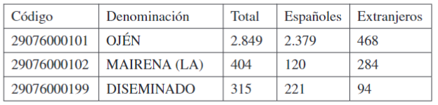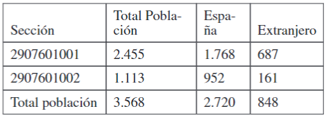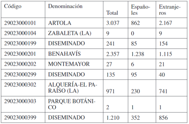 Haciendo una recapitulación, podemos señalar que para dar cumplimiento a nuestro objetivo, hemos trabajado con el volumen correspondiente a 2018 de población total, el número de españoles y el número de extranjeros correspondientes a municipios con volúmenes de población muy reducidos pertenecientes a la provincia de Málaga, obtenidos del Padrón Municipal de Habitantes, empleando dos unidades espaciales distintas: por un lado, el seccionado censal; por otro, la cartografía correspondiente al Nomenclátor.