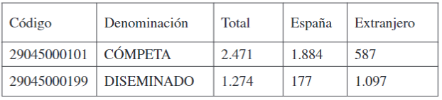 Para terminar, es preciso indicar que incluso en el caso en el que el Nomenclátor identifica una única entidad singular en el municipio, como en su momento indicamos, ésta queda dividida en núcleo y, si existe población en esa condición, en diseminado. Y, una vez más, es posible realizar un estudio mucho más exhaustivo de los residentes a partir del Nomenclátor que empleando el seccionado censal. Para ejemplificar esto, nos centraremos en Cómpeta, situado en la comarca de la Axarquía, con un total de 3.745 empadronados, de los cuales 2.061 son españoles y el resto extranjeros. Se trata de un municipio en el qu ela presencia es estos últimos es porcentualmente muy elevada (suponen el 45%), y utilizando el seccionado censal poco más podríamos decir. Sin embargo, la información que nos ofrece el Nomenclátor permite ahondar en la distribución territorial de ambos grupos de población, tal y como se aprecia en la tabla 8.