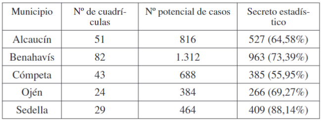 En la tabla ofrecemos, en primer lugar, el número de cuadrículas correspondientes a cada municipio en 2018; en segundo, el número potencial de valores de los que podríamos disponer de no estar ninguno de ellos afectado por el secreto estadístico (resultante de multiplicar el número de cuadrículas por las 16 variables); por último, el número de casos protegidos, más el porcentaje que suponen sobre el total potencial. Pues bien, en el mejor de los casos, correspondiente al municipio de Cómpeta, el 55,59% de los valores están protegidos por el secreto estadístico, cifra que asciende al 88,14% en Sedella, lo que, como habíamos indicado al comienzo del párrafo, invalida en la práctica esta fuente de información.